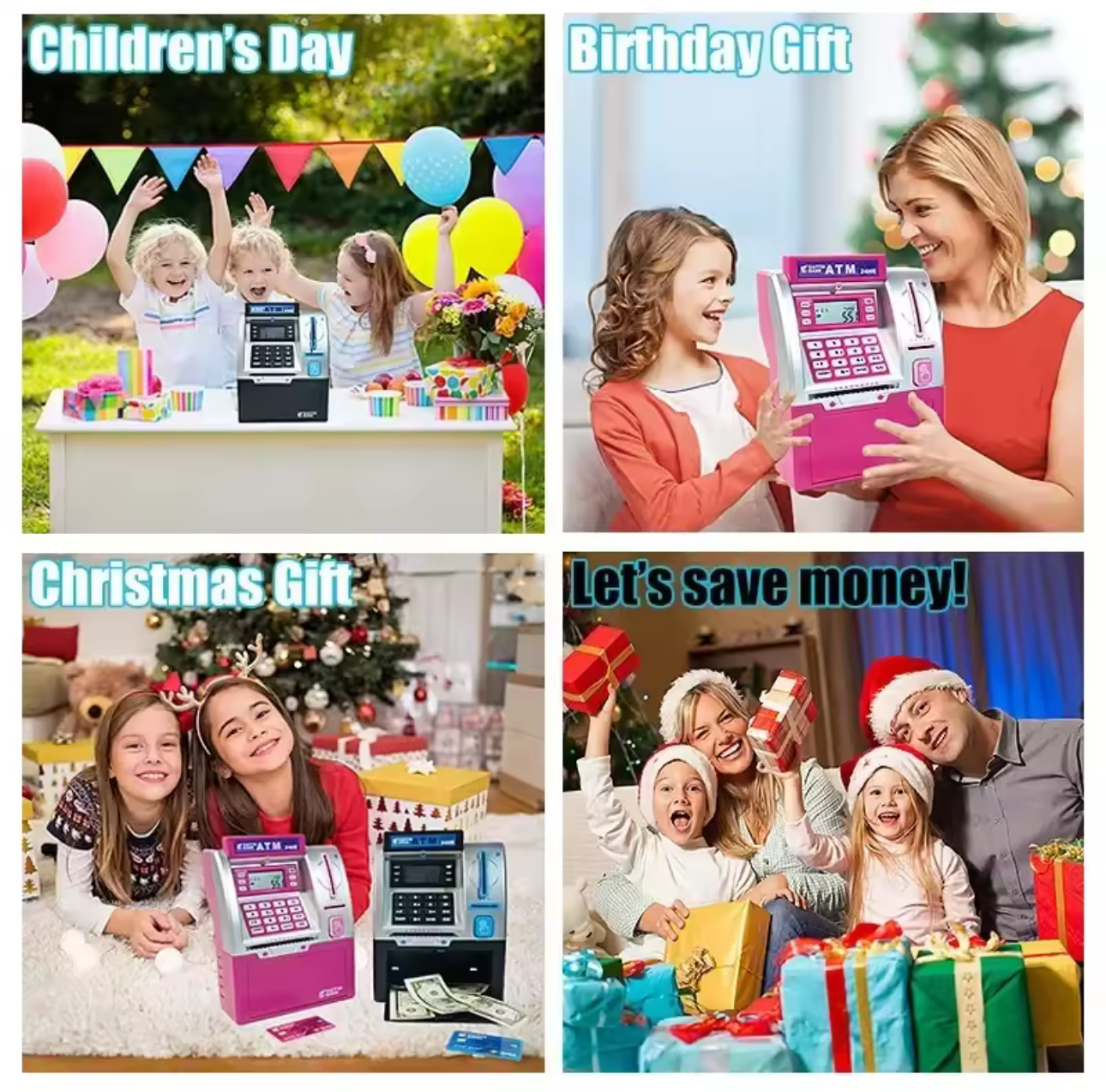 Turn saving into a game! This realistic kids’ ATM bank lets little money managers deposit coins and bills, set a savings goal, and “withdraw” like a real ATM—complete with a PIN and debit card.